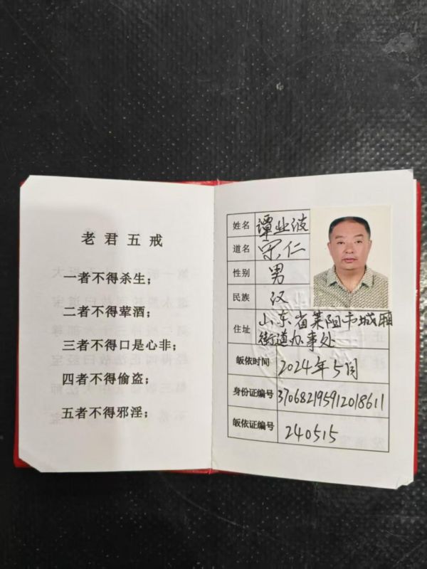 谭业波对中华传统文化研究维度广泛,于佛道文化尤有深究,2024年5月正式皈依全真华山派道教协会,在道教文化传承与实践中再迈新阶。