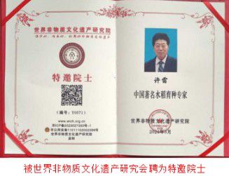 2024年3月被世界非物质文化遗产研究会聘为特邀院士同时颁发中国著名水稻育种专家院士证书。